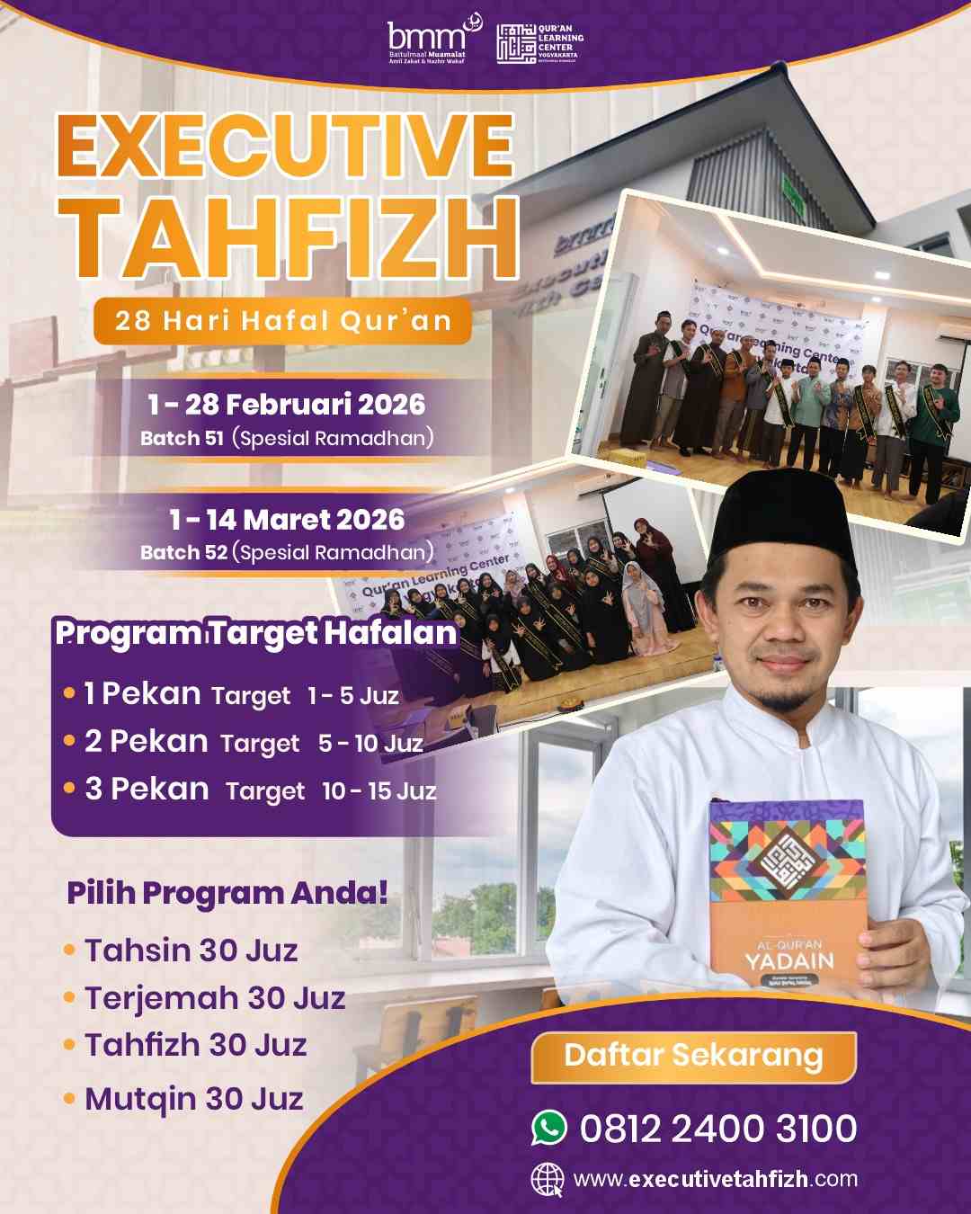Eksekutif, menurut Kamus Besar Bahasa Indonesia (KBBI), adalah seseorang yang memiliki tanggung jawab besar dalam mengambil keputusan penting atau mengelola urusan strategis. Executive Tahfizh adalah program intensif profesional untuk menghafal Al-Quran dengan fokus pada kualitas hafalan, pembinaan karakter, dan pengembangan spiritual. Dilaksanakan dalam lingkungan bebas gangguan, program ini memungkinkan peserta berkonsentrasi penuh selama periode tertentu, seperti satu bulan atau lebih.
